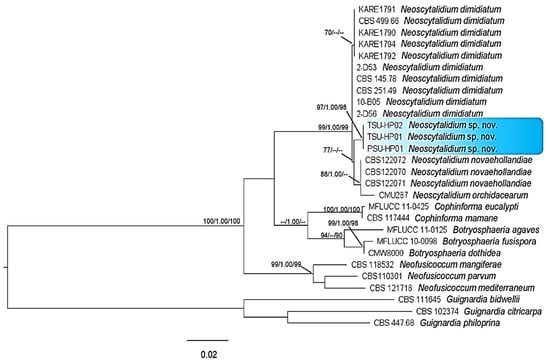 Phylogenetic tree of combined DNA sequences of ITS, tef1-α and tub of Neoscytalidium sp. and related species; PSU-HP01, TSU-HP01 and TSU-HP02 were samples from this study. Bootstrap support values for MP and ML equal to or greater than 70% and Bayesian inference (BI) equal to or greater than 0.90 were defined as MP/BI/ML above or below the nodes. Guignardia bidwellii, G. citricarpa and G. philoprina were used as the outgroup.