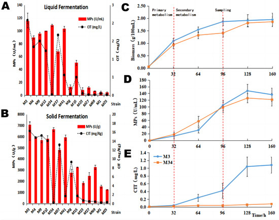 Figure 1. Overview of MPs and CIT production by M. purpureus strains. Shake flask fermentations in liquid media (A) and solid-state fermentations (B), using M. purpureus M3 and 13 additional strains. Time course analysis of M. purpureus M3 and M34 cell growth (C), relative yields of MPs (D), and relative productions of CIT (E). Results are shown as the mean of three biological replicates; the error bars represent the standard deviation of the means (n = 3).
