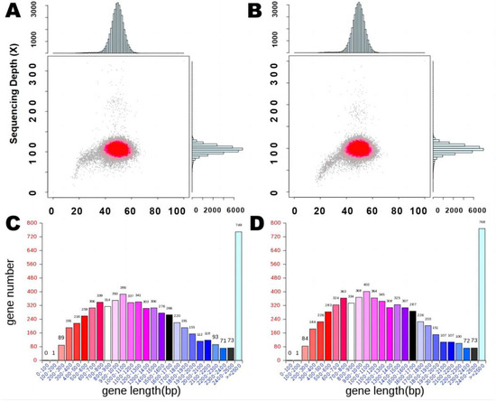 Figure 2. Genome sequence characteristics of M. purpureus M3 and M34. Correlation analysis between GC content and sequencing depth in (A) M3 and (B) M34; gene length distribution in (C) M3 and (D) M34.