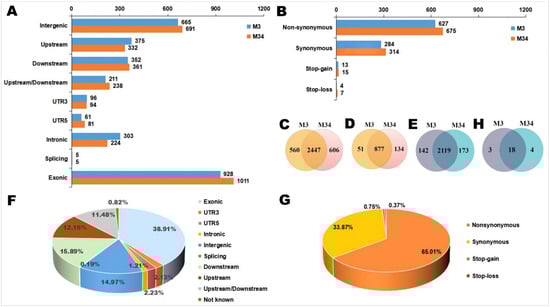 Figure 5. Location statistics of the SNPs in strains M3 and M34. (A) Distribution of genomes-based SNPs in different gene regions. UTR, untranslated region; SNP, single nucleotide polymorphism. (B) Variation information of the genomes-based SNPs located in the exonic regions. (C) Venn diagram of genomes-based SNPs. (D) Venn diagram of genomes-based SNPs located in the exonic regions. (E) Venn diagram of transcriptome-based SNPs. (F) Distribution of transcriptome-based SNPs in different gene regions. (G) Variation information of the transcriptome-based SNPs located in the exonic regions. (H) Venn diagram of transcriptome-based SNPs in primary metabolic genes.