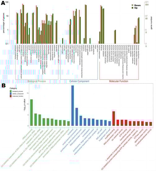 Figure 7. Functional classification of DEGs in strains M3 and M34. (A) GO functional classification of DEGs. Red bars represent the number of downregulated DEGs; green bars show upregulated DEGs. (B) The top 30 GO enrichment terms from M34 vs. M3. The green, blue and red bars represent the biological process, cellular component, and molecular function, respectively.
