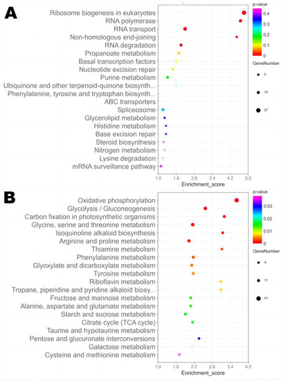 Figure 8. KEGG enrichment analysis of DEGs in M. purpureus strains M34 vs. M3. Scatter plot of the top 20 KEGG pathways enriched by downregulated DEGs (A) or upregulated DEGs (B) in strain M34. The size of the dot indicates the number of DEGs, and a smaller p-value indicates a more significant enrichment.