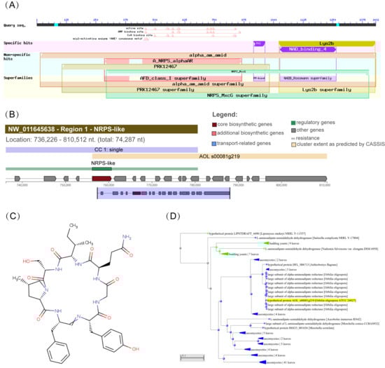 Figure 1. Sequence and phylogenetic analyses of Aoaar. (A) Conserved domains of Aoaar from Blastp prediction using amino acid sequence; antiSMASH-predicted biosynthetic gene clusters (NRPS) (B) and their predicted core structures (C); (D) Phylogenetic tree of gene Aoaar.