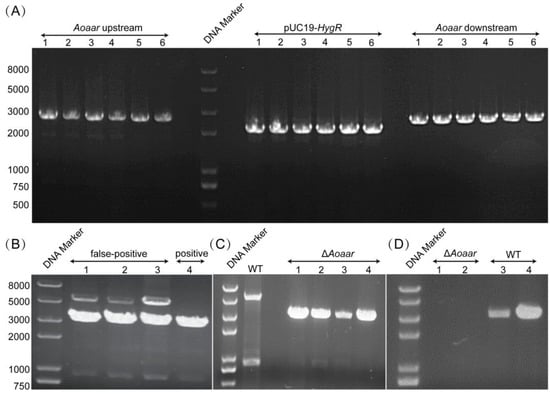 Figure 2. Screening and verification of ΔAoaar mutant strain. (A) Verification of the PCR amplification of the Aoaar upstream homologous arm (2500 bp), downstream homologous arm (2500 bp), and hygromycin resistance gene expression cassette (2121 bp); (B) Verification of the ΔAoaar mutant strain using diagnostic PCR, showing only the predicted 3145 bp of the amplicon. As a comparison, both the 3145 bp and 5438 bp fragments were generated for false-positive transformants; (C) Verification of four positive ΔAoaar mutant strains, and the WT strain that was used as control; (D) RT-PCR verification: the WT strain has a target band (4299 bp), and the ΔAoaar mutant strain has no target band via RT-PCR.