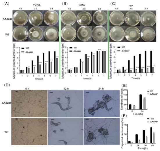 Figure 3. Comparison of growth, trap formation, and nematocidal activity between the WT strain and ΔAoaar mutants. Mycelial growth rates of the WT strain and ΔAoaar mutants incubated on TYGA (A), CMA (B), and PDA (C) media. (D) Trap formation of the WT strain and mutants, as induced by addition of nematodes for 6, 12, and 24 h, based on microscopic observation. (E) The number of nematode-induced traps produced by the WT and mutants at 12 and 24 h. (F) Percentage of nematodes captured by the WT strain and mutants at various time-points. p < 0.05 (*), p < 0.01 (**), p < 0.001 (***), p < 0.0001 (****).