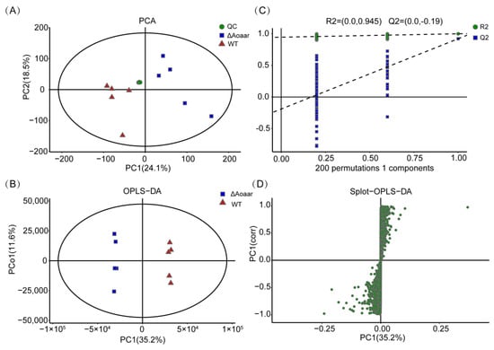 UPLC-Q Exactive Orbitrap/MS was used for the metabolomics analysis, and the repeatability and reliability of the data were assessed using PCA and OPLS-DA, and found to be high. As shown in Figure 4A,B, the Aoaar knockout had discernible effects on the A. oligospora metabolome. To avoid overfitting of the supervised PLS-DA model, the permutation test for PLS-DA was applied, and the results indicated that the PLS-DA model was valid (Figure 4C). An S-plot displays the distribution of metabolites between the WT and the ΔAoaar strains (Figure 4D).
