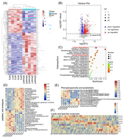 Figure 5. Global metabolic changes between WT and the ΔAoaar mutant. (A) The global metabolite changes are represented as a heatmap. (B) Metabolite changes are represented as a volcano plot depicting significant metabolite changes between WT and the Aoaar knockout strain (fold change > 2, p < 0.05, and VIP value > 1). (C) Pathway enrichment analysis. (D) The differences in peptides and analogues between WT and the ΔAoaar mutant. (E) The differences in phenylpropanoids and polyketides between WT and the ΔAoaar mutant; (F) The differences in lipids and lipid-like molecules between WT and the ΔAoaar mutant.