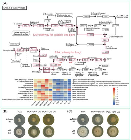 Figure 6. The effect of Aoaar knockout on the lysine biosynthesis pathway. (A) Diagram showing pathways for lysine biosynthesis in bacteria and plants (DAP pathway), and in fungi (AAA pathway). The heatmap shows the abundance of metabolites (left) involved in amino acid-related metabolic pathways (right). (B) A comparison of the effects of lysine supplementation on the growth of WT and the Aoaar knockout strain at day 3. (C) A comparison of the effects of lysine supplementation on the growth of WT and the Aoaar knockout strain at day 5. aar, α-aminoadipate reductase.
