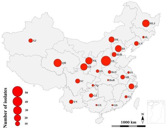 Geographic origins where Rhizoctonia isolates were collected. The size of the red spots represented the number of Rhizoctonia isolates collected from each province, municipality, or autonomous region. Abbreviation and full name of provinces, municipalities, and autonomous regions are as follows: AH, Anhui province; BJ, Beijing municipality; CQ, Chongqing municipality; FJ, Fujian province; GD, Guangdong province; GS, Gansu province; GX, Guangxi Zhuang autonomous region; GZ, Guizhou province; HeB, Hebei province; HeN, Henan province; HLJ, Heilongjiang province; HuB, Hubei province; IM, Inner Mongolia autonomous region; JL, Jilin province; JS, Jiangsu province; LN, Liaoning province; NX, Ningxia Hui autonomous region; QH, Qinghai province; SC, Sichuan province; SN, Shaanxi province; SX, Shanxi province; XJ, Xinjiang Uygur autonomous region; YN, Yunnan province; ZJ, Zhejiang province.