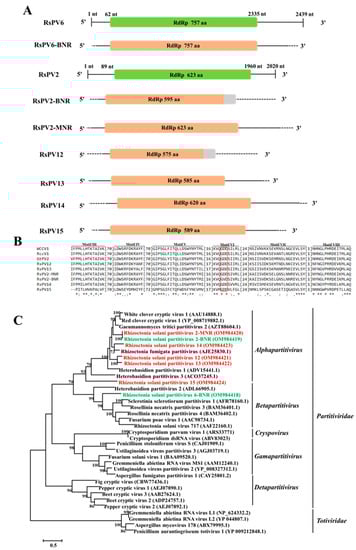Multiple alignments of aa sequences of RdRp of these seven partitiviruses found in BNR and MNR, and their homologous viruses were performed, and six conserved motifs (motif III–VIII) were revealed in the viral RdRp domain. Furthermore, GDD tripeptide (the hallmark of most viral RdRps) was found in motif VI (Figure 2B). Phylogenetic analysis showed that RsPV6-BNR clustered together with members of the genus Betapartitivirus, while RsPV2-BNR, RsPV2-MNR, and RsPV12–15 were most closely related to members of the genus Alphapartitivirus (Figure 2C).
