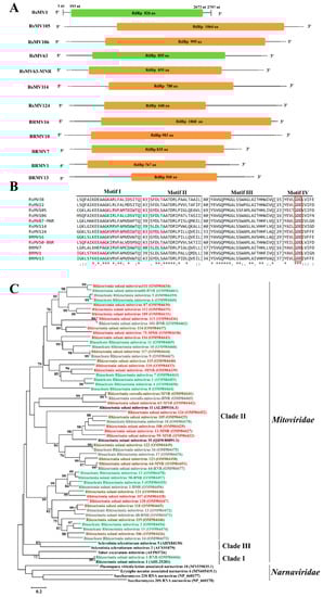 - Jiang, D.H.; Ayllon, M.A.; Marzano, S.Y.L.; Lefkowitz, E.J.; Davison, A.J.; Siddell, S.G.; Sabanadzovic, S.; Simmonds, P.; Smith, D.B.; Orton, R.J. ICTV virus taxonomy profile: Mymonaviridae. J. Gen. Virol. 2019, 100, 1343–1344. [Google Scholar] [CrossRef]