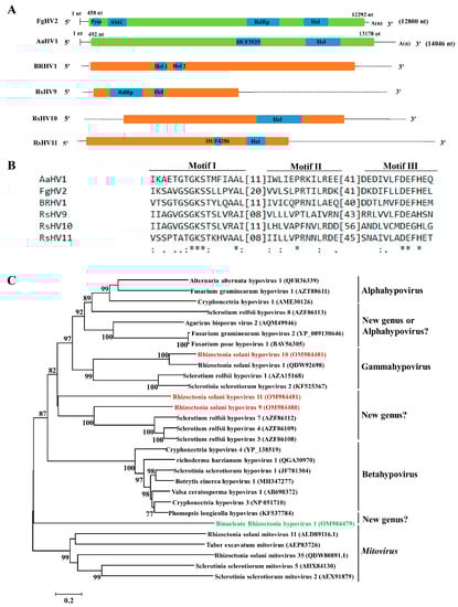 Phylogenetic analysis based on the aa sequences of polyprotein of the four hypoviruses and their homologous viruses showed that RsHV10 clustered into the genus Gammahypovirus, and RsHV9 and RsHV11 clustered together with unclassified hypoviruses, such as Sclerotium rolfsii hypovirus 3, 4, and 7 [63]. BRHV1 clustered into the family Hypoviridae, but BRHV1 was relatively distinct from other hypoviruses within the family Hypoviridae (Figure 4C).
