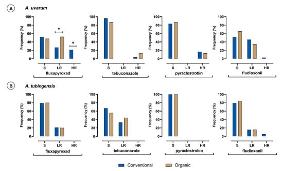 Frequency (%) of sensitive (S), lowly resistant (LR), and highly resistant (HR) isolates of Aspergillus uvarum (A) (n = 102) and Aspergillus tubingensis (B) (n = 151) populations obtained from conventional (blue columns) or organic (brown columns) vineyards to fluxapyroxad, tebuconazole, pyraclostrobin, and fludioxonil. Asterisk (*) indicates significant differences between the two farming systems according to a series of z-test analyses (p = 0.05).