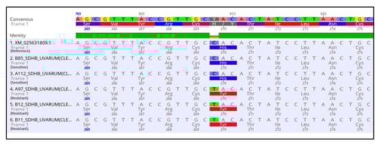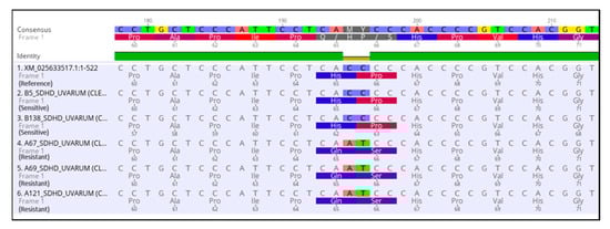 To determine whether the observed resistance phenotypes were associated with the presence of mutations in the fungicide target genes, sdhB, sdhC, sdhD, Cyp51, and cytb genes of A. uvarum, sdhB, sdhC, sdhD, and Cyp51 of A. tubingensis, and sdhB, sdhC, and sdhD of A. carbonarious were amplified and sequenced. The sequencing of sdhB, sdhC, and sdhD encoding genes in A. uvarum revealed that 11 isolates (26.2 %) possessed a histidine (CAC) replacement by tyrosine (TAC) at codon 270 of sdhB (Figure 2 and Figure 3). Furthermore, in 15 (35.7%) A. uvarum isolates, a double mutation (H65Q/S66P) was detected in the sdhD subunit (Figure 2). The H65Q/S66P mutations are caused by the replacement of histidine (CAC) by glutamine (CAA) at codon 65 and of proline (CCC) by serine (TCC) at codon 66 of sdhD (Figure 4). Interestingly, in a limited number (n = 5, 11.9%) of the sequenced isolates, the identified mutations H270Υ in sdhB and H65Q/S66P in sdhD co-occurred (Figure 2). No mutation was detected in the sdhB, sdhC, and sdhD subunits in any of the 31 A. tubingensis isolates showing low levels of resistance to fluxapyroxad. Similarly, no mutation in any of the three (3) sdh subunits sequenced was observed in the A. carbonarious isolates that were found to be resistant to fluxapyroxad.