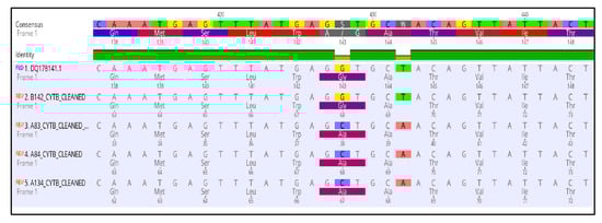 Multiple sequence alignment of the nucleotides and amino acids of the cytochrome b gene in the QoI resistant isolates of Aspergillus uvarum possessing the G143A mutation.