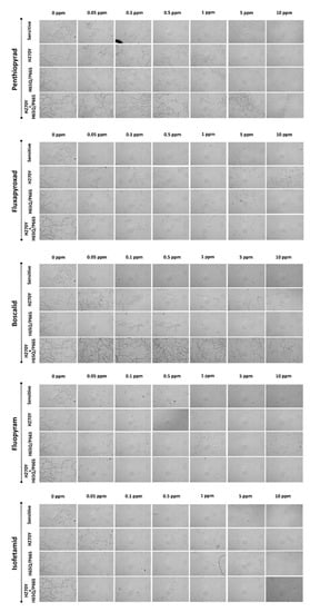 The sensitivity data of several SDHI molecules used in vineyards against fungal pathogens in the mutated and wild-type A. uvarum isolates are summarized in Table 3, while the response of the conidia of representative isolates, grown on different fungicide concentrations, is shown in Figure 6. Results showed a slight variation regarding the intrinsic activity of the fungicides tested against the A. uvarum isolates of wild-type sensitivity, with mean EC50 values ranging from 0.003 μg mL−1 for fluxapyroxad, which was the most active molecule, to 0.019 μg mL−1 for penthiopyrad, which was the least active among the five (5) SDHI molecules included in the study.