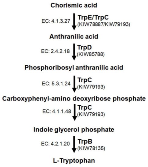 Putative tryptophan biosynthesis pathway in F. pedrosoi. The corresponding transcript IDs are indicated in parenthesis below their protein names. The Enzyme Commission (EC) numbers are depicted on the left side of each step of the pathway.