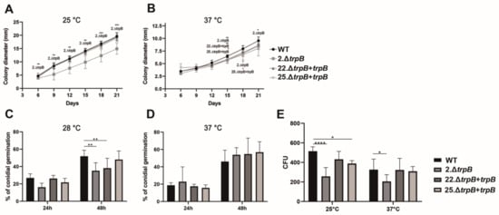 To quantify colony growth, 2.∆trpB, 22.ΔtrpB + trpB, 25.ΔtrpB + trpB, and WT strains were point-inoculated with same amount of conidia (103) onto the surface of SAB agar containing 500 μg/mL of L-trp (SAB + L-trp). The plates were incubated at 28 °C or 37 °C. Colonies’ diameters were measured every 3 days for 3 weeks. Two independent experiments were carried out in triplicate. Data collected were analyzed using the program GraphPad Prism. Mixed-effects analysis and Dunnett’s multiple comparisons test were used to compare variations between the control (WT) and test groups.