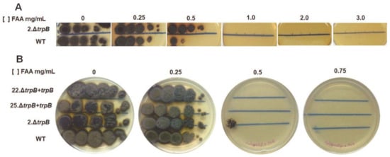 In yeasts, mutants for tryptophan biosynthesis genes are resistant to 5-FAA [52,53,54,55]. This antimetabolite, when assimilated, is converted into the toxic product 5-fluorotryptophan. In our work, we decided to evaluate whether trpB deletion in F. pedrosoi confers resistance to 5-FAA, in order to expand the genetic manipulation tools for selection and counter-selection of mutants. For this purpose, we spotted serial dilutions of WT and trpB strains on SAB + L-trp plates supplied by increasing amounts of 5-FAA (0.25; 0.5; 1.0; 2.0; and 3.0 mg/mL). The F. pedrosoi trpB mutant has higher resistance to 5-FAA compared to the WT strain. After 13 days of incubation at 28 °C, we observed that the trpB mutant tolerates 0.5 mg/mL of 5-FAA at low conidial density (102), while the WT grows only on 105 and 104 conidial spots. None of the strains grew on plates with >0.75 mg/mL of 5-FAA (Figure 6A). The reintroduction of trpB allele restored the ΔtrpB susceptibility to the WT level (Figure 6B).