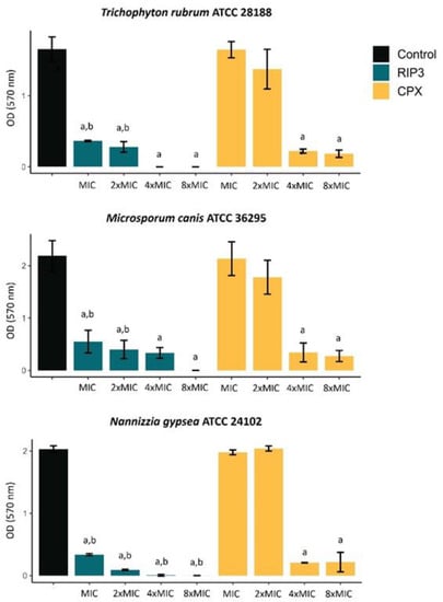 Effect of RIP3 on the biofilm biomass of dermatophytes expressed as absorbance of the crystal violet staining. The results are the means ± SD from three independent experiments. Significant difference (p < 0.05) when compared to drug-free growth control (a) and to CPX at the respective MIC value (b). OD, optical density; MIC, minimal inhibitory concentration; RIP3, riparin III; CPX, ciclopirox.