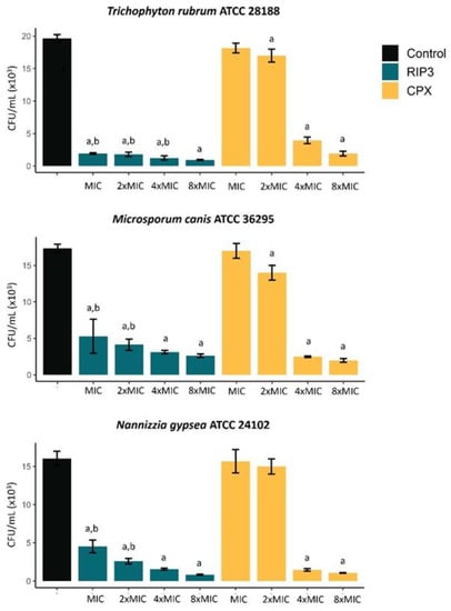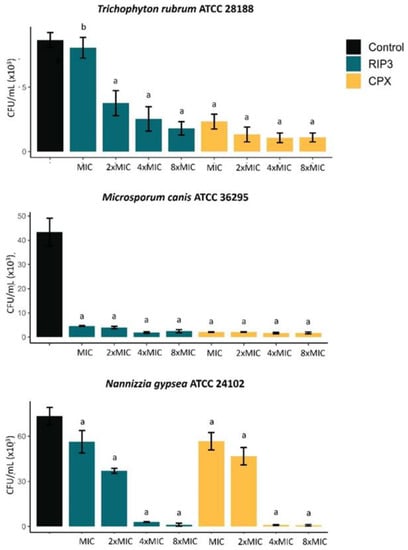 Effect of RIP3 on the viability of in vitro biofilms of dermatophytes determined by quantifying the number of colony-forming units (CFU). The results are the means ± SD from three independent experiments. Significant difference (p < 0.05) when compared to drug-free growth control (a) and to CPX at the respective MIC value (b). OD, optical density; MIC, minimal inhibitory concentration; RIP3, riparin III; CPX, ciclopirox.