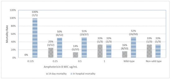 Figure 1. Correlation of amphotericin B minimal inhibitory concentration (MIC) with 14-day and in-hospital mortality.