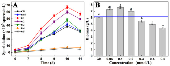 FeCl2·4H2O was used to prepare the Fe2+ mother liquor, with a concentration of 1 mol/L. The corresponding volume of the Fe2+ mother liquor was added into the culture medium to adjust the Fe2+ concentrations of the culture medium to 0.05, 0.1, 0.2, 0.3, 0.4, and 0.5 mmol/L. Then, the culture medium was inoculated and cultured in accordance with the method described in Section 2.2. Samples were taken on days 6–11 to determine sporulation and biomass [22]. Medium with the same volume of deionized water added was regarded as the control group.