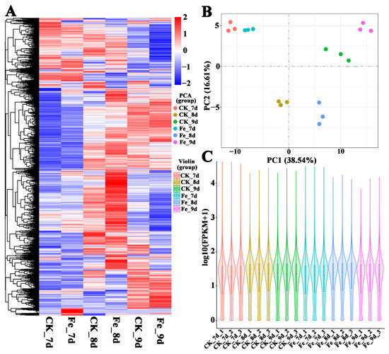 Figure 1 shows that A. cinnamomea started to produce spores rapidly on day 7. What is more, A. cinnamomea was in the early stage of rapid sporulation on day 8 and was in the middle stage of rapid sporulation on day 9. In other words, days 7, 8, and 9 were the beginning, early, and middle stages of the rapid sporulation of A. cinnamomea in submerged fermentation, respectively. Therefore, our sequencing samples were A. cinnamomea mycelia incubated for 7, 8, and 9 days in the culture medium without Fe2+ (referred to as “CK_7d”, “CK_8d”, and “CK_9d”, respectively) and A. cinnamomea mycelia incubated for 7, 8, and 9 days in the culture medium with 0.1 mmol/L Fe2+ (referred to as “Fe_7d”, “Fe_8d”, and “Fe_9d”, respectively) for a total of six groups. Three biological replicates were taken for each group. For example, three biological replicates of the “CK_7d” group were recorded as “CK_7d_1”, “CK_7d_2”, and “CK_7d_3”, and the rest may be deduced by analogy. A total of 18 samples were used for RNA-seq.
