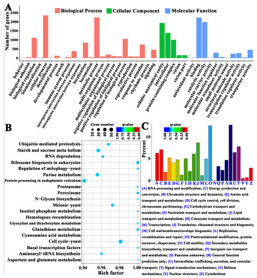 GO (A), KEGG (B), and KOG (C) enrichment analyses of DEGs.