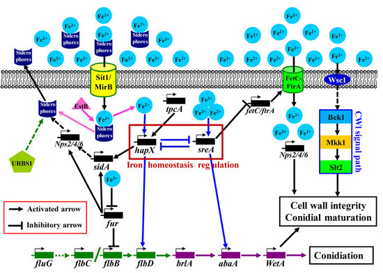 The ferric uptake transcriptional regulator Fur can inhibit the expression of the flbB gene and further inhibit sporulation. However, when intercellular iron ion concentrations increase, Fe2+ combines with Fur to form the Fe2+–Fur complex to inhibit the expression of fur and alleviate the inhibition of flbB, which indirectly promotes sporulation. In addition, Fe2+ acts on the Wsc1 baroreceptor and promotes the expression of relevant genes in the CWI signaling pathway through a series of cascade reactions, thereby accelerating the cell wall synthesis and maturation of the asexual spores of A. cinnamomea. The O-methyltransferase TpcA can promote the expression of hapX then promote the synthesis of siderophores. The regulatory protein URBS1 can directly or indirectly regulate the synthesis of siderophores.