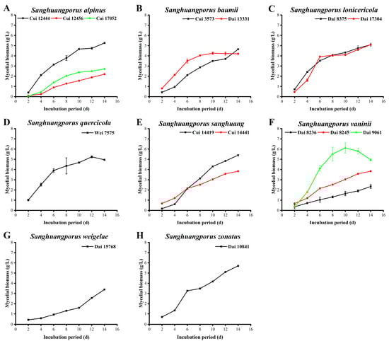 Variations in mycelial biomass during submerged fermentation of 15 wild strains from 8 species of Sanghuangporus. (A) Sanghuangporus alpinus Cui 12444, Cui 12456, and Cui 17052. (B) Sanghuangporus baumii Cui 3573 and Dai 13331. (C) Sanghuangporus lonicericola Dai 8375 and Dai 17304. (D) Sanghuangporus quercicola Wei 7575. (E) Sanghuangporus sanghuang Cui 14419 and Cui 14441. (F) Sanghuangporus vaninii Dai 8236, Dai 8245, and Dai 9061. (G) Sanghuangporus weigelae Dai 15768. (H) Sanghuangporus zonatus Dai 10841.