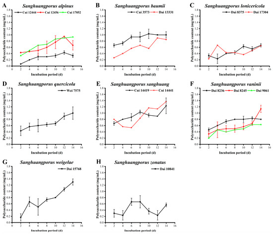 Variations in polysaccharide contents during submerged fermentation of 15 wild strains from 8 species of Sanghuangporus. (A) Sanghuangporus alpinus Cui 12444, Cui 12456, and Cui 17052. (B) Sanghuangporus baumii Cui 3573 and Dai 13331. (C) Sanghuangporus lonicericola Dai 8375 and Dai 17304. (D) Sanghuangporus quercicola Wei 7575. (E) Sanghuangporus sanghuang Cui 14419 and Cui 14441. (F) Sanghuangporus vaninii Dai 8236, Dai 8245, and Dai 9061. (G) Sanghuangporus weigelae Dai 15768. (H) Sanghuangporus zonatus Dai 10841.