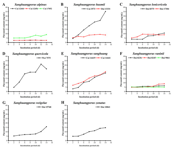 Variations in flavonoid contents during submerged fermentation of 15 wild strains from 8 species of Sanghuangporus. (A) Sanghuangporus alpinus Cui 12444, Cui 12456, and Cui 17052. (B) Sanghuangporus baumii Cui 3573 and Dai 13331. (C) Sanghuangporus lonicericola Dai 8375 and Dai 17304. (D) Sanghuangporus quercicola Wei 7575. (E) Sanghuangporus sanghuang Cui 14419 and Cui 14441. (F) Sanghuangporus vaninii Dai 8236, Dai 8245, and Dai 9061. (G) Sanghuangporus weigelae Dai 15768. (H) Sanghuangporus zonatus Dai 10841.