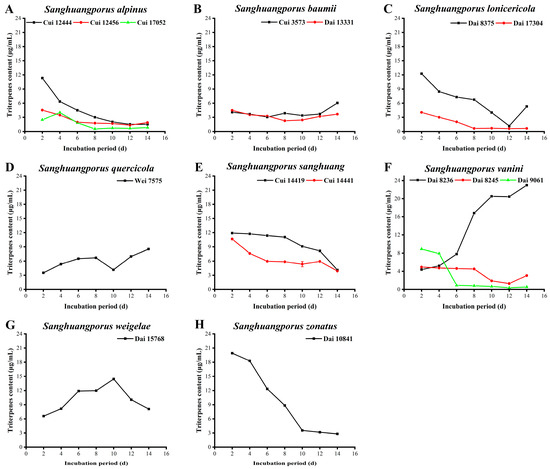Variations in triterpenoid contents during submerged fermentation of 15 wild strains from 8 species of Sanghuangporus. (A) Sanghuangporus alpinus Cui 12444, Cui 12456, and Cui 17052. (B) Sanghuangporus baumii Cui 3573 and Dai 13331. (C) Sanghuangporus lonicericola Dai 8375 and Dai 17304. (D) Sanghuangporus quercicola Wei 7575. (E) Sanghuangporus sanghuang Cui 14419 and Cui 14441. (F) Sanghuangporus vaninii Dai 8236, Dai 8245, and Dai 9061. (G) Sanghuangporus weigelae Dai 15768. (H) Sanghuangporus zonatus Dai 10841.