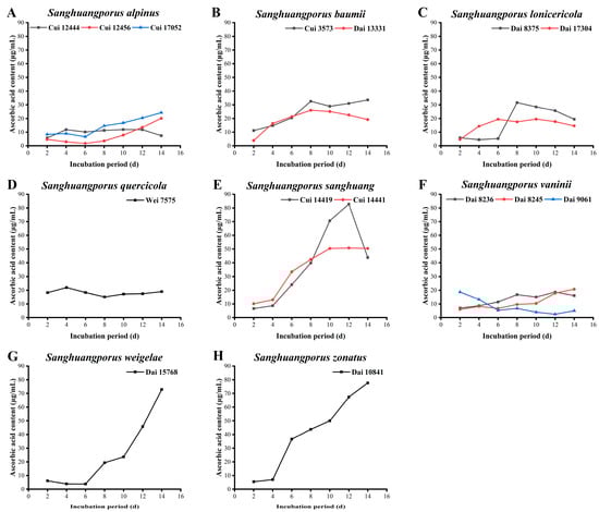 Variations in ascorbic acid contents during submerged fermentation of 15 wild strains from 8 species of Sanghuangporus. (A) Sanghuangporus alpinus Cui 12444, Cui 12456, and Cui 17052. (B) Sanghuangporus baumii Cui 3573 and Dai 13331. (C) Sanghuangporus lonicericola Dai 8375 and Dai 17304. (D) Sanghuangporus quercicola Wei 7575. (E) Sanghuangporus sanghuang Cui 14419 and Cui 14441. (F) Sanghuangporus vaninii Dai 8236, Dai 8245, and Dai 9061. (G) Sanghuangporus weigelae Dai 15768. (H) Sanghuangporus zonatus Dai 10841.