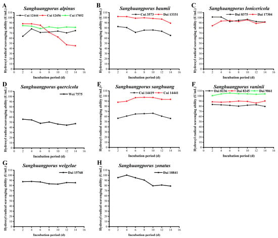 Variations in hydroxyl radical scavenging activities during submerged fermentation of 15 wild strains from 8 species of Sanghuangporus. (A) Sanghuangporus alpinus Cui 12444, Cui 12456, and Cui 17052. (B) Sanghuangporus baumii Cui 3573 and Dai 13331. (C) Sanghuangporus lonicericola Dai 8375 and Dai 17304. (D) Sanghuangporus quercicola Wei 7575. (E) Sanghuangporus sanghuang Cui 14419 and Cui 14441. (F) Sanghuangporus vaninii Dai 8236, Dai 8245, and Dai 9061. (G) Sanghuangporus weigelae Dai 15768. (H) Sanghuangporus zonatus Dai 10841.