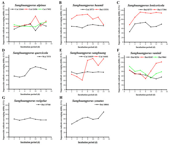 Variations in superoxide radical scavenging activities during submerged fermentation of 15 wild strains from 8 species of Sanghuangporus. (A) Sanghuangporus alpinus Cui 12444, Cui 12456, and Cui 17052. (B) Sanghuangporus baumii Cui 3573 and Dai 13331. (C) Sanghuangporus lonicericola Dai 8375 and Dai 17304. (D) Sanghuangporus quercicola Wei 7575. (E) Sanghuangporus sanghuang Cui 14419 and Cui 14441. (F) Sanghuangporus vaninii Dai 8236, Dai 8245, and Dai 9061. (G) Sanghuangporus weigelae Dai 15768. (H) Sanghuangporus zonatus Dai 10841.