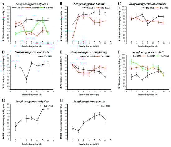 Variations in DPPH radical scavenging activities during submerged fermentation of 15 wild strains from 8 species of Sanghuangporus. (A) Sanghuangporus alpinus Cui 12444, Cui 12456, and Cui 17052. (B) Sanghuangporus baumii Cui 3573 and Dai 13331. (C) Sanghuangporus lonicericola Dai 8375 and Dai 17304. (D) Sanghuangporus quercicola Wei 7575. (E) Sanghuangporus sanghuang Cui 14419 and Cui 14441. (F) Sanghuangporus vaninii Dai 8236, Dai 8245, and Dai 9061. (G) Sanghuangporus weigelae Dai 15768. (H) Sanghuangporus zonatus Dai 10841.