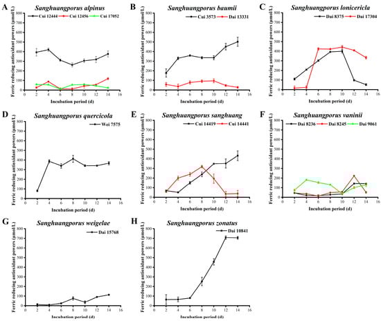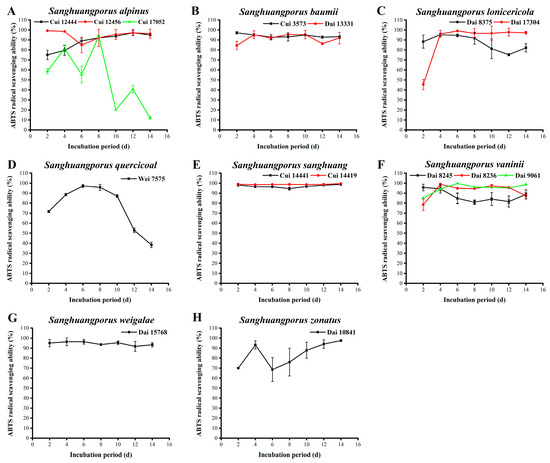 Variations in ABTS radical scavenging activities during submerged fermentation of 15 wild strains from 8 species of Sanghuangporus. (A) Sanghuangporus alpinus Cui 12444, Cui 12456, and Cui 17052. (B) Sanghuangporus baumii Cui 3573 and Dai 13331. (C) Sanghuangporus lonicericola Dai 8375 and Dai 17304. (D) Sanghuangporus quercicola Wei 7575. (E) Sanghuangporus sanghuang Cui 14419 and Cui 14441. (F) Sanghuangporus vaninii Dai 8236, Dai 8245, and Dai 9061. (G) Sanghuangporus weigelae Dai 15768. (H) Sanghuangporus zonatus Dai 10841.