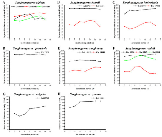 Variations in superoxide dismutase activities during submerged fermentation of 15 wild strains from 8 species of Sanghuangporus. (A) Sanghuangporus alpinus Cui 12444, Cui 12456, and Cui 17052. (B) Sanghuangporus baumii Cui 3573 and Dai 13331. (C) Sanghuangporus lonicericola Dai 8375 and Dai 17304. (D) Sanghuangporus quercicola Wei 7575. (E) Sanghuangporus sanghuang Cui 14419 and Cui 14441. (F) Sanghuangporus vaninii Dai 8236, Dai 8245, and Dai 9061. (G) Sanghuangporus weigelae Dai 15768. (H) Sanghuangporus zonatus Dai 10841.