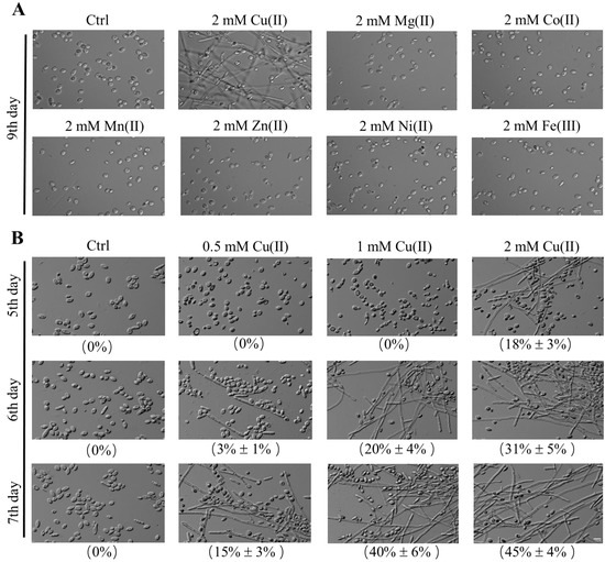 Taken together, these findings indicate that Cu(II) specifically promotes the yeast-to-hypha transition of Y. lipolytica.