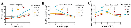 Cu(II) accumulation during Cu(II) -mediated dimorphic transition in Y. lipolytica. (A) DCW of the Y. lipolytica. (B) Total or (C) intracellular Cu(II) accumulation of the Y. lipolytica. For (A–C): cells of the Y. lipolytica Strain W29 were grown in YPD liquid media in the absence (Ctrl) or presence of 0.5, 1, and 2 mM CuSO4 at 28 °C for 4 to 8 days. Data are presented as averages of biological triplicates (n = 3). Triangles indicate the start of dimorphic transition in different cultures, respectively.