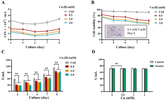 Subsequently, we investigated the effect of Cu(II) on the physiology of Y. lipolytica during the yeast-to-hypha transition. Firstly, the overall cell viability was analyzed by CFU enumeration. The results showed that the overall viability of the cells grown in the medium containing 0.5, 1, and 2 mM CuSO4 were all significantly lower than the control cells without Cu(II) supplementation during days 4–8 (Figure 3A).