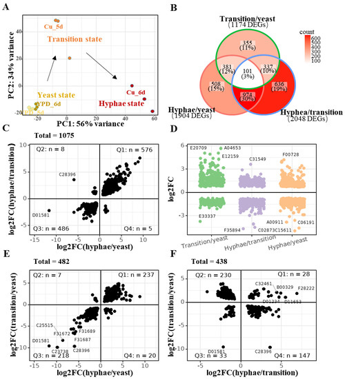 Transcriptomic changes during Cu(II)-mediated dimorphic transition in Y. lipolytica. (A) Principal component analysis (PCA) and the definition of the yeast-, transition- and hyphae-state cells. Arrows indicate the progress of the yeast-to-hypha transition can be treated as two steps. (B) Venn diagrams showing the overlap of genes differentially expressed under three comparisons (log2FC > 0.5, p.adj < 0.05). Counts of DEGs in each subset were given in places, and the proportions are calculated with the number of unique genes in three comparisons. Region-filling colors also indicated the variance in the number of DEGs. (C–F) Gene expression changes of DEGs. Each point represents a gene, and the adjacent text label indicates what the gene is. To save space, only the unique parts of gene model names are given in text labels. (C,E,F) A comparison of the consistency of the shared DEGs in three comparisons. In each subplot, gene expression changes were plotted as a point by two dimensions, which correspond to two of the three comparisons. The panel was divided into four quadrants (Q1, Q2, Q3, and Q4) by horizontal and vertical lines anchored in the zero point of two axes. If a gene was upregulated or downregulated consistently, it will appear in Q1 and Q3, respectively. By contrast, if the gene expression was turned over, it will appear in Q2 or Q4. To align the three subplots vertically or horizontally, they are placed in (C), (E), and (F), separately. (D) Comparison-specific DEGs. These genes’ expression changes are plotted by comparison group as indicated by the horizontal axis and colors.