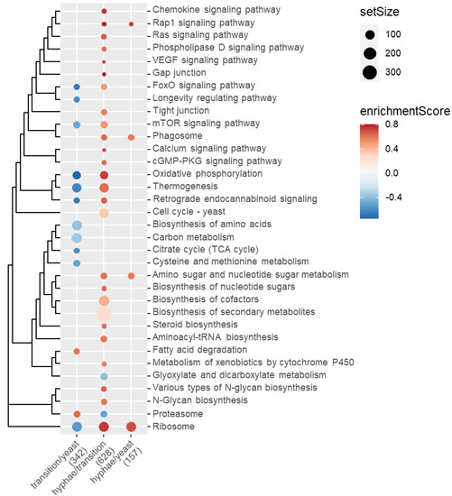 GSEA analysis of KEGG pathways in Cu(II)-mediated dimorphic transition. There are approximately 2300 genes were assigned to 400 KEGG pathways, and those significantly activated or suppressed in at least one comparison (horizontal axis) were shown, after manual curation of the raw GSEA result. These pathways were clustered by the Jaccard similarity and shown as a dendrogram (left). Point size indicates how many different genes were included for a pathway, and color indicates the enrichment score, of which a negative value implies the pathway is suppressed, and a positive value implies the pathway is activated, respectively.