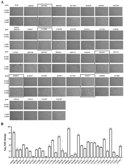 Furthermore, we selected 33 highly differentially expressed genes related to ion transport, cell division, and transcriptional regulation from transcriptomic data for overexpression (Figure 6A and Table S2), and found that four of them, which are YALI1_B07500g, YALI1_C12900g, YALI1_E04033g, and YALI1_F29317g, promoted filamentation in the presence of 0/1 mM Cu(II) (Figure 6A). YALI1_B07500g encodes a protein of 351 aa. that shares sequence similarity (42.4% identity) with S. cerevisiae zinc finger protein STP3, which is involved in pre-tRNA splicing and uptake of branched-chain amino acids. YALI1_C12900g encodes a protein of 269 aa. that shares sequence similarity (31.5% identity) with S. cerevisiae suppressor protein STM1, which binds specifically G4 quadruplex and purine motif triplex nucleic acid structures. YALI1_E04033g encodes a protein of 147 a.a. that shares sequence similarity (62.1% identity) with Schizosaccharomyces pombe myosin regulatory light chain cdc4, which is involved in cytokinesis and required for the formation and function of the contractile ring. YALI1_F29317g encodes a protein of 111 a.a. that shares sequence similarity (38.8% identity) with S. cerevisiae transcription initiation factor IIA subunit 2, which is a component of the transcription machinery of RNA polymerase II and plays an important role in transcriptional activation. As shown in Figure 6B, all these genes were overexpressed successfully, of which about 75% were induced more than four-fold (log2 fold change > 2). Thus, our results show that the overexpression of four novel genes, which are YALI1_F29317g, YALI1_B07500g, YALI1_E04033g, and YALI1_C12900g, can promote filamentation of Y. lipolytica.