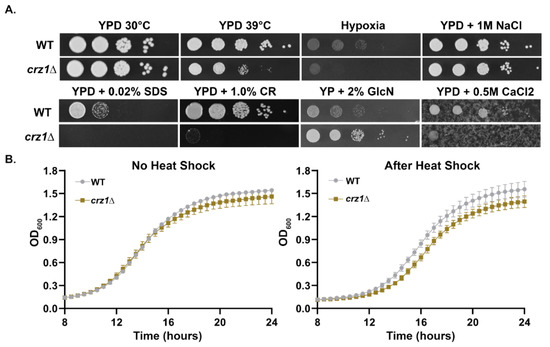 Growth assays of the crz1Δ mutant under various stress conditions. (A) The WT strain H99 and the crz1Δ mutant were grown overnight in liquid YPD at 30 °C, washed, adjusted to the same cell concentration, serially diluted, and spotted onto the media and incubated under the indicated conditions. Images were taken two days after incubation. (B) The overnight cultures of H99 and the crz1Δ mutant were split into two groups and diluted to OD600 = 0.1 in YPD medium. Three replicates of each strain were included per group. One group was inoculated into a 24-well microplate and incubated at 30 °C with double orbital shaking in a Biotek Epoch 2plate reader. Growth was monitored every 30 min by measuring OD600. The second group was heat shocked by incubation at 42 °C for 20 min in a thermocycler prior to monitoring growth at 30 °C in the Epoch 2.