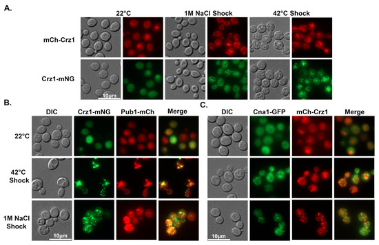 Under non-stimulating conditions, Crz1 showed diffused cytoplasmic localization in most cells and enriched nuclear localization in a small proportion of the population (Figure 2A), as we expected based on our previous study [11]. In response to heat (42 °C) or salt (1 M NaCl) shock, we found that both an N-terminal mCherry-tagged Crz1 fusion protein (mCh-Crz1) and a C-terminal mNeonGreen-tagged Crz1 fusion protein (Crz1-mNG) localized to granules in all cells (Figure 2A). Previously, Kozubowski et al. found that calcineurin (Cna1) co-localizes with the polyA-binding protein Pub1 in stress granules at 37 °C [22]. Pub1 is a known marker for stress granules in response to starvation, heat shock, or acidification [23]. Because Crz1 is a known downstream target of calcineurin, we decided to test if Crz1 co-localizes with calcineurin catalytic subunit Cna1 or Pub1 at high temperatures or in high salt. To that end, we introduced the Crz1-mNG into a strain harboring Pub1-mCherry and the mCh-Crz1 into a strain harboring Cna1-GFP. Under the non-stimulating control condition (22 °C), Crz1 and Pub1 were mostly diffused in the cytoplasm with some cells showing enrichment in the nucleus (Figure 2B, top left images). By contrast, calcineurin Cna1 was in the cytoplasm and likely excluded from the nucleus (Figure 2C, top right images). In response to 42 °C or salt shock, we found that Crz1 localized to granules and these granules co-localized with Pub1 (Figure 2B) and calcineurin Cna1 (Figure 2C). Taking these observations into consideration, we hypothesize that co-localization of Crz1 and the phosphatase calcineurin to stress granules may be a mechanism to promote their interaction and facilitate dephosphorylation of Crz1 and its subsequent translocation to the nucleus.