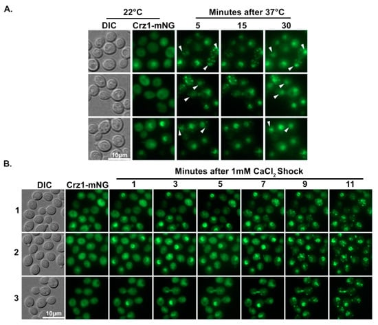 The following supporting information can be downloaded at: https://www.mdpi.com/article/10.3390/jof9020252/s1, Table S1: Strains, plasmids, and primers used; Figure S1: Crz1 cytosolic, nuclear, and granular localization Video S1: Crz1 response to 1 mM Calcium Video: Crz1 response to 1 mM Calcium; Video S3: Crz1 dynamic localization to the bud neck. Reference [37] is cited in the Supplementary Materials.