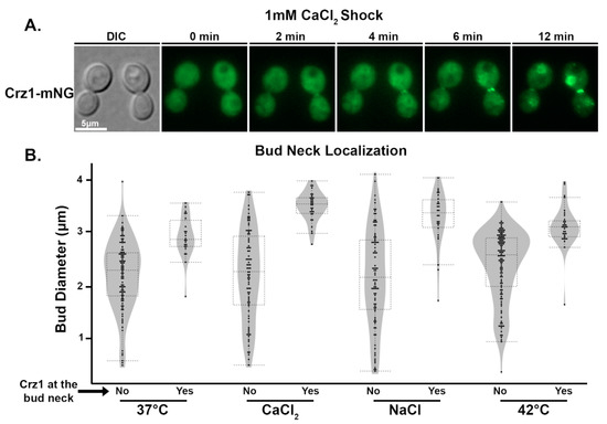 3.4. Crz1 Localizes to the Mother–Daughter Bud Neck in Response to Stress Conditions